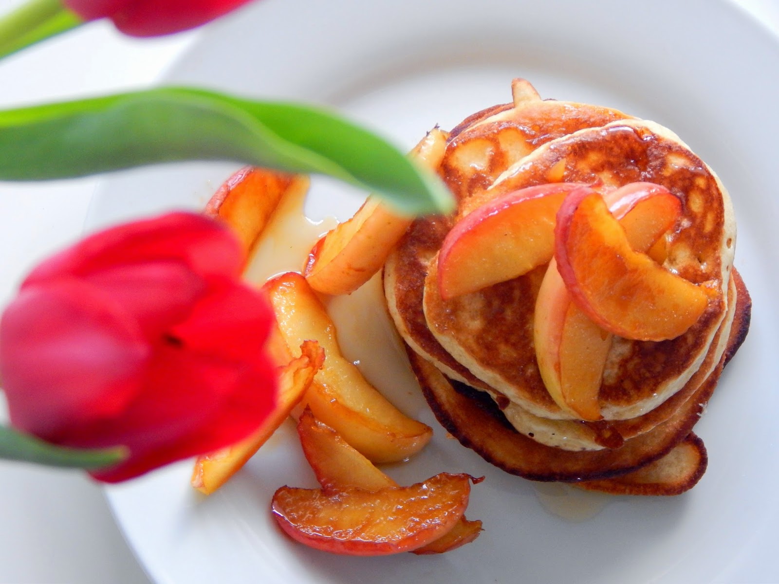 Auch wenn ich im Moment morgens nicht wirklich viel Zeit habe: Frühstück ist bei mir meist ein Muss. Manchmal ist es nur ein lieblos geschmiertes Brot, an anderen Tag etwas herzhaftes wie Rührei, und jetzt hatte ich Lust auf etwas süßes, also zauberte ich spontan Pancakes mit karamellisierten Äpfeln. Mein ausführliches Pancake-Rezept, das ich lustiger Weise ganz genau vor einem Jahr gepostet habe,  findet ihr hier, denn für diese Variante hier habe ich nichts wirklich abgemessen, sondern einfach nur geschätz, denn wie meine Mutter  immer sagt: “Wiegen und Abmessen ist Zeitverschwendung”. Falls ihr die Mengen auch einfach nur schätzen wollt benötigt ihr: