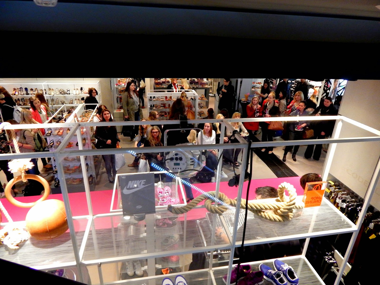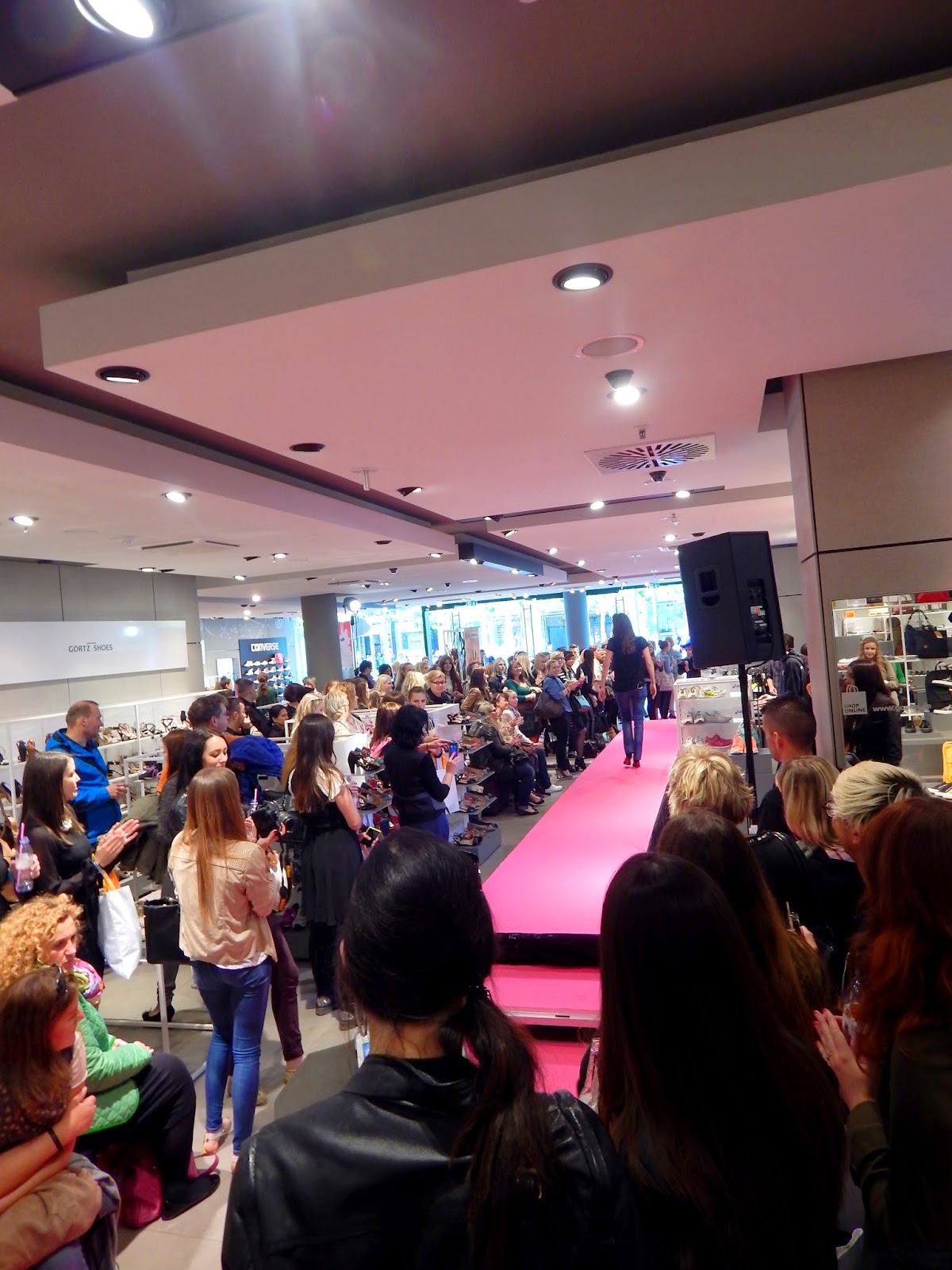Hatte man sich den Weg durch die Schaulustigen vor dem Laden erkämpft, gab es drinnen direkt Gast-Bändchen und VIP Cards für uns, und schon konnten wir uns ins Getümmel stürzen. Von kostenlosen Mexx Goodiebags und Probierdüften, außerdem Evian und das neue Lifestylegetränk Bayao, bis hin zu den 20% Rabatt auf alles im Shop, die es dank der VIP Card gab, war alles dabei. Als besonderes Highlight folgte es dann eine Modenschau, bei der die neuen Schuhtrends präsentiert wurden. “Leider” zogen die schönen Sommeroutfits der Models die ganze Aufmerksamkeit auf sich, so dass man – oder zumindest ich – fast gar nicht auf die Schuhe achten konnte. Nach der Show betrat eine Laufstegtrainerin, und selbst ehemaliges Model, die Bühne und gab ein paar mutigen Mädels aus dem Publikum ein kleines Laufstegtraining, während der DJ im Hintergrund einen Hit nach dem anderen spielte.