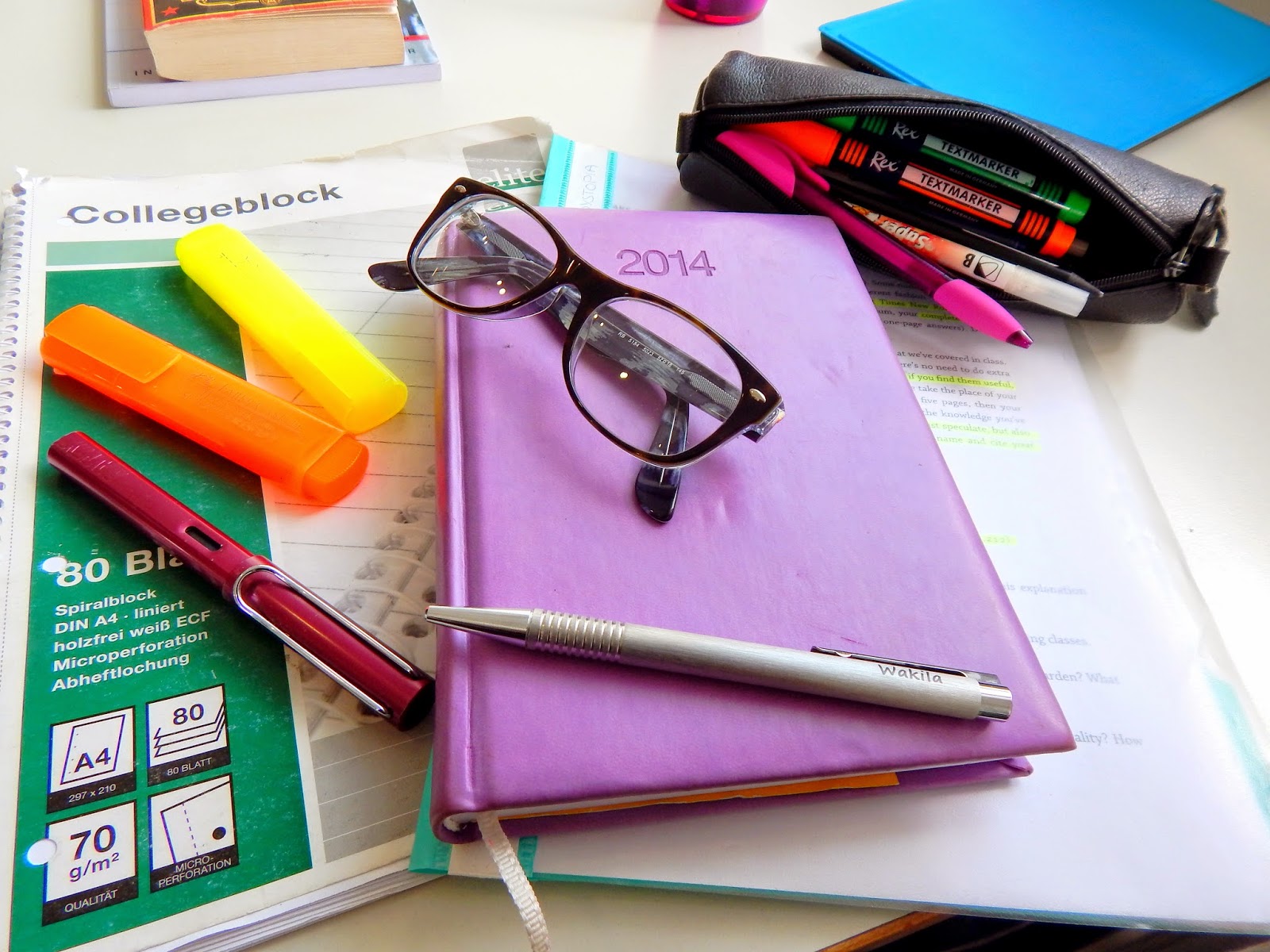 Neben den eigentlich Büchern und Unterlagen, mit denen gearbeitet werden muss, habe ich in der Bibliothek immer meinen Terminplaner bei mir. Ich kann gar nicht ohne ihn. Es gibt immer etwas, das schnell notiert werden muss, oder ein Termin, der nachgeschlagen werden muss. Außerdem brauche ich vor allem beim Arbeiten meine liebsten Stifte, dazu gehören Textmarker, sowie mein Lamy Füller und mein Lamy Kugelschreiber. Dann noch meine Brille, und ich kann konzentriert und organisiert arbeiten!