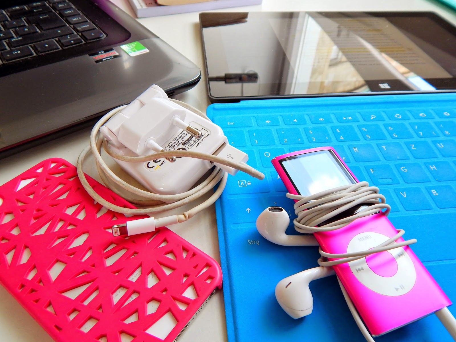 Neben Büchern brauche ich natürlich auch meine elektronischen Hilfsmittel. Dass das Handy dabei ist, ist selbstverständlich. Aber wie oft ist es passiert, dass ich eine kleine Pause vom Arbeiten brauche, eine Runde Candy Crush spielen möchte und mein Akku leer geht. Deswegen: Immer an das Ladekabel denken, vor allem wenn lange study sessions geplant sind. Neben meinem Handy ist auch mein iPod mit von der Partie. Je nachdem woran ich arbeite, fällt es mir mit Musik leichter. Dann natürlich noch mein Laptop und mein Tablet (ich habe das Microsoft Surface).