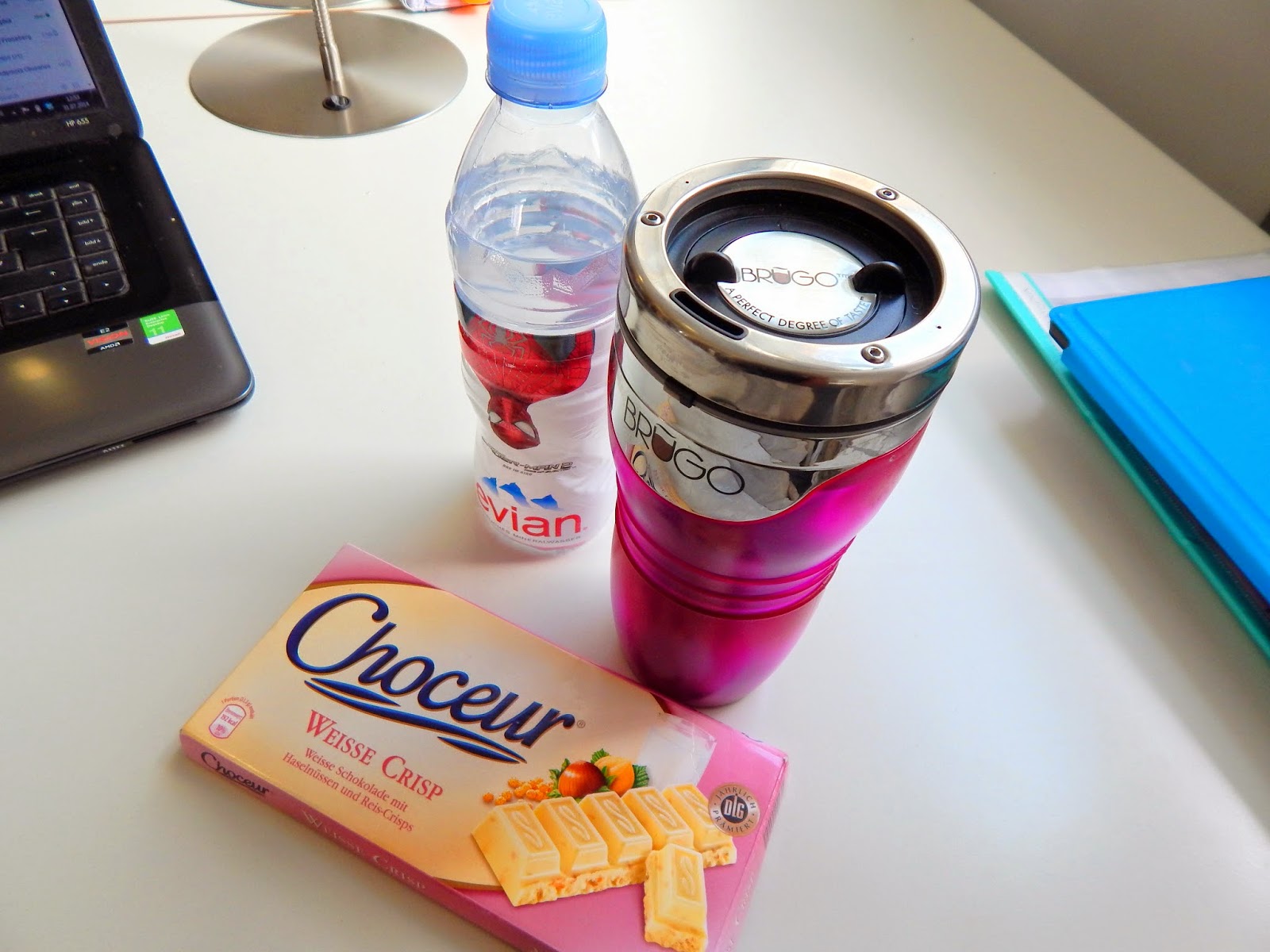 Wenn man den ganzen Tag in einem stickigen Gebäude ist und den Kopf anstrengt, sollte man das Essen, und vor allem das Trinken nicht vergessen. Ich habe immer eine Flasche Wasser dabei, außerdem noch Kaffee oder Tee in meinem geliebten Brugo Thermobecher. Außerdem brauche ich an solchen Tagen etwas süßes. Meistens greife ich da auf Schokolade zurück. Wenn ich den ganzen Tag in der Bibliothek bin, gehe ich aber natürlich auch in der Mensa oder außerhalb etwas richtiges essen, damit ich etwas im Magen habe.