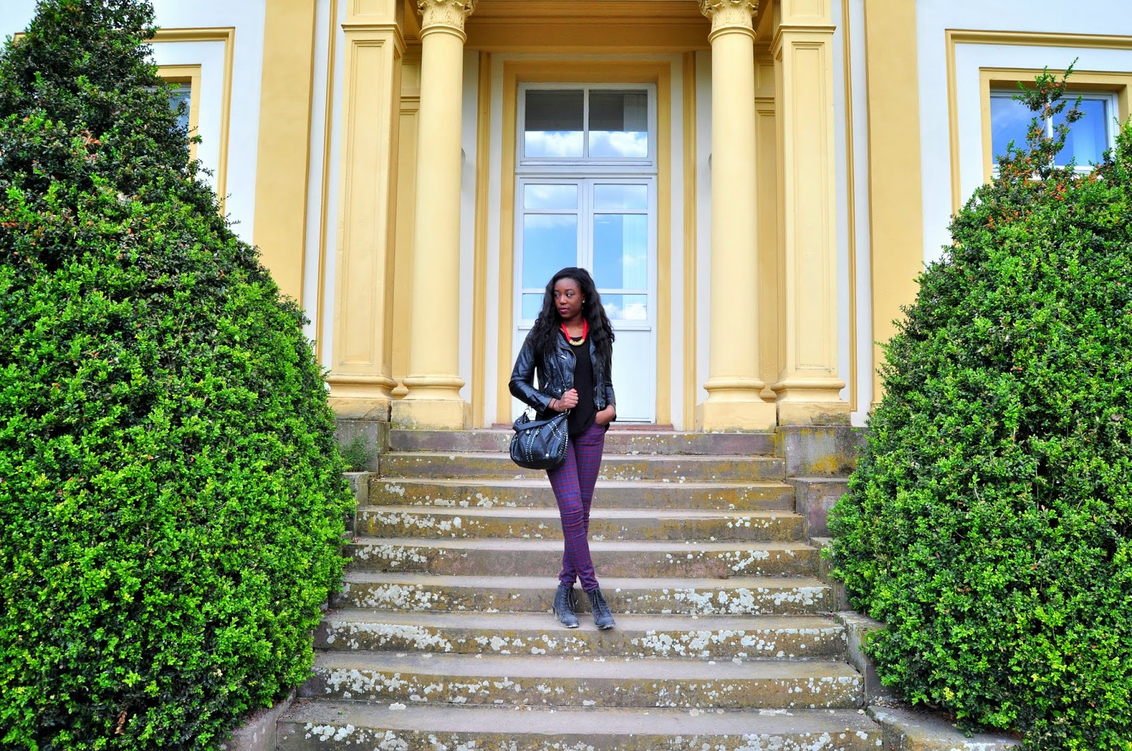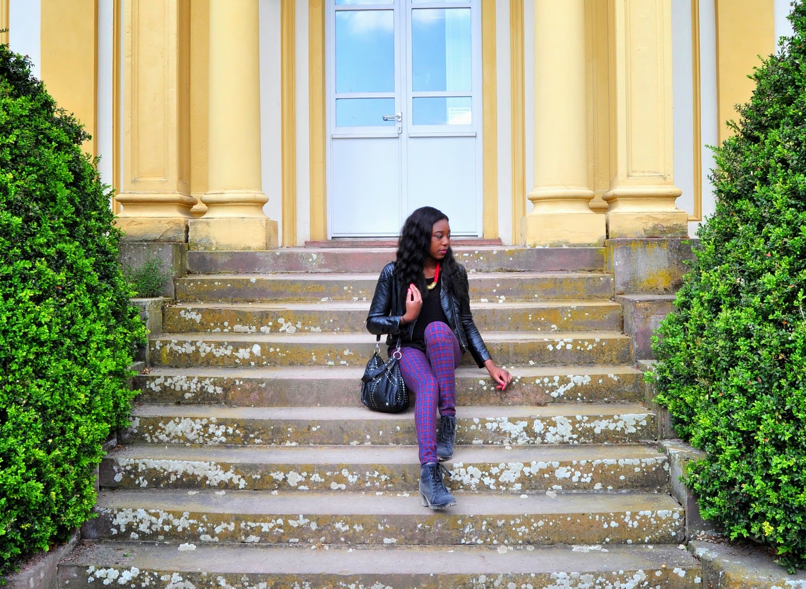 Auch wenn mein Outfit selbst nichts mit Blumen zu tun hat, steht dieser Outfitpost ganz im Zeichen des Frühlings und der Blüten! Es gibt nichts Schöneres, als in einem riesen Park voll mit den verschiedensten Pflanzen und Blumen spazieren zu gehen, die Sonne und ein Eis zu genießen, und noch einmal abzuschalten, bevor der Unistress wieder losgeht. Wie in letzter Zeit so oft, hatte ich auch an diesem Tag keine Lust auf flache Schuhe, deswegen habe ich meine bequemen Lieblingsboots angezogen, zusammen mit einer neuen, heißgeliebten blau-rot karierten Hose (ich bin wirklich in sie verliebt!), dazu einen schwarzen Sweater, eine rote Statementkette und meine Lederjacke. Außerdem habe ich beim Kramen meine alte George, Gina & Lucy Tasche gefunden, von der ich die für die Marke typische Schnalle abgemacht habe. Das ist der Fall, weil ich eigentlich ganz und gar nicht auf GGL Taschen stehe, diese aber liebe, weil sie nicht aussieht, wie die üblichen Taschen der Marke.