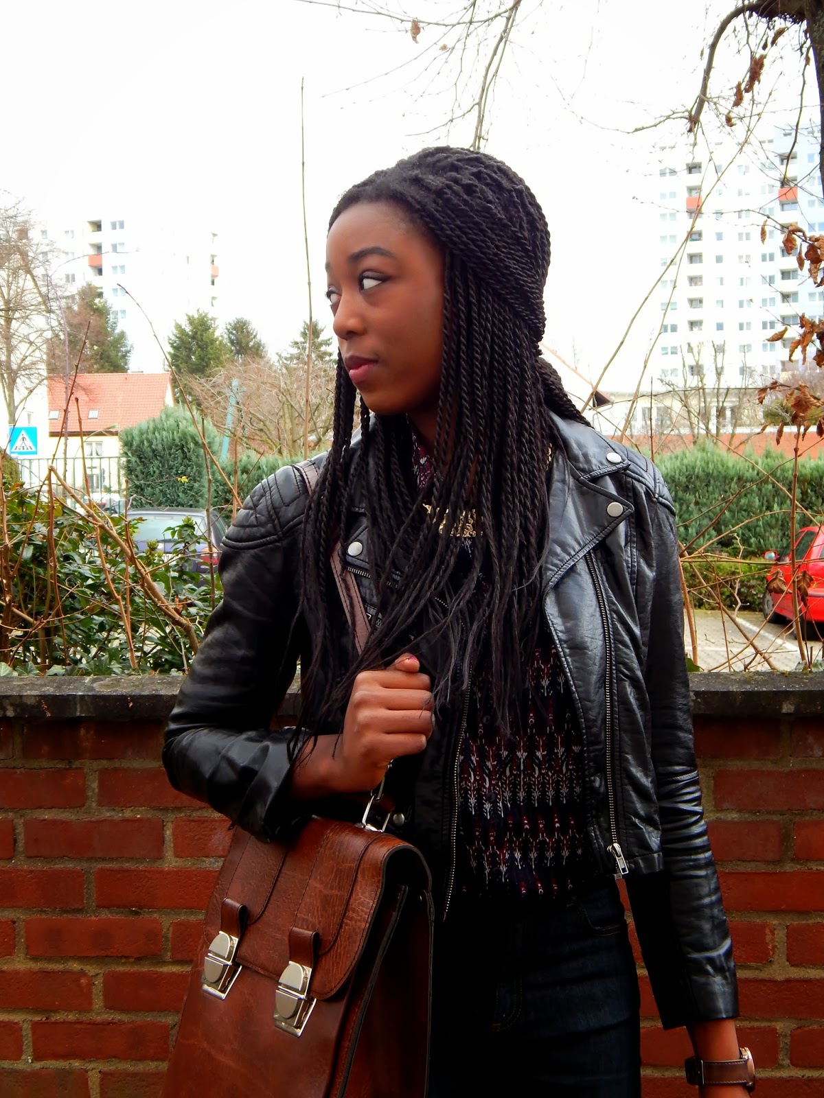 It’s time for another outfit! The last few days have been quite warm – as warm as it can be in Febuary – so it was time to pull the leather jacket out of my closet. Paired with a blouse, a statement necklace, boots, my favorite bag, and I’m ready to go! Nothing too special, but still more than a simple t-shirt and jeans.