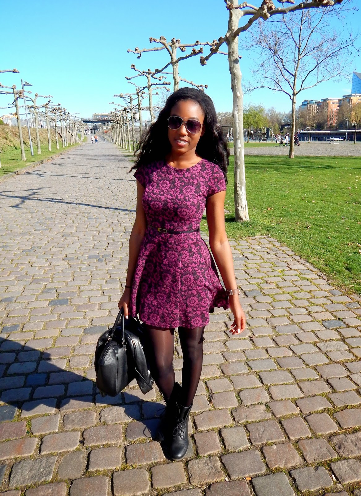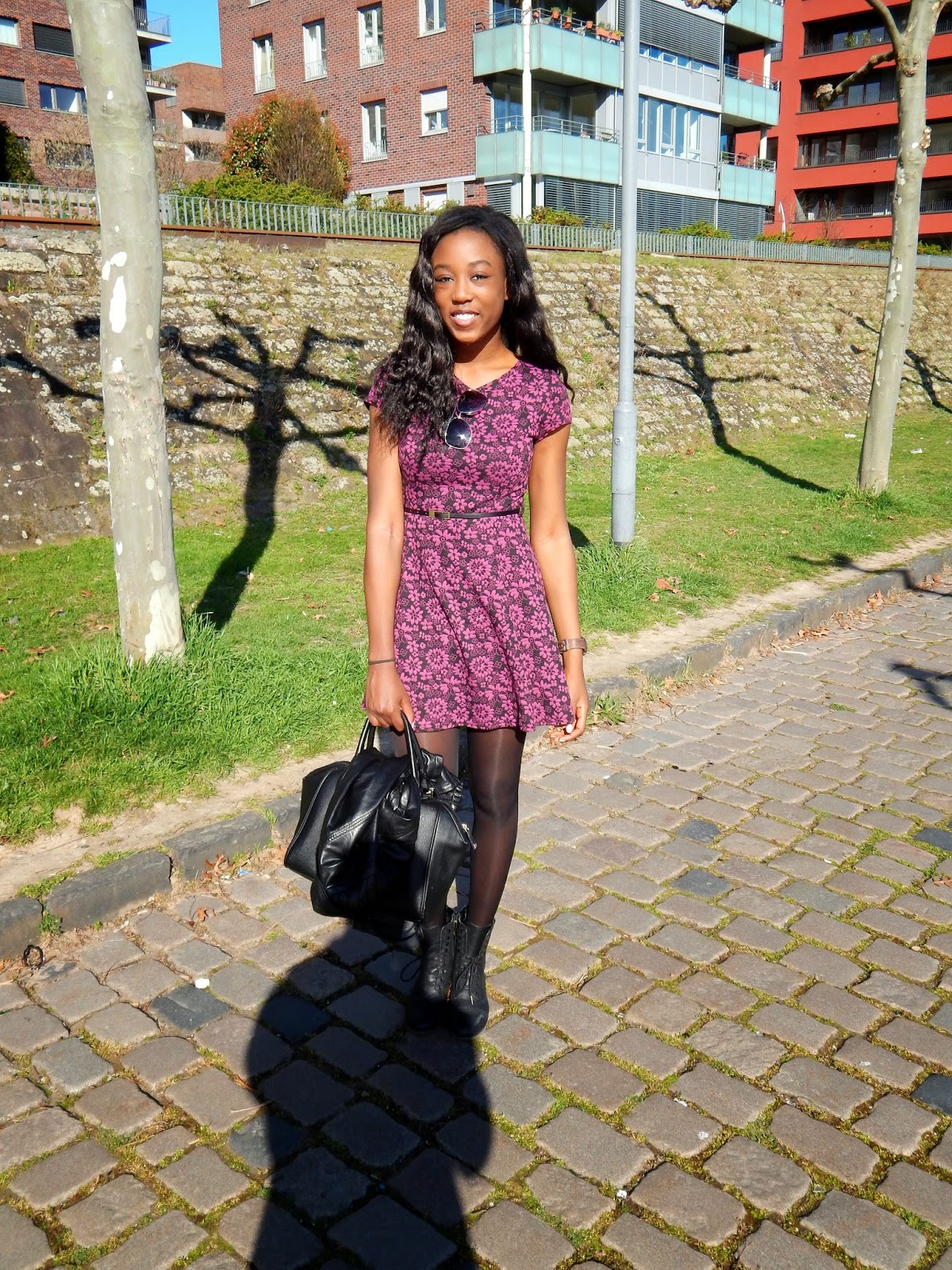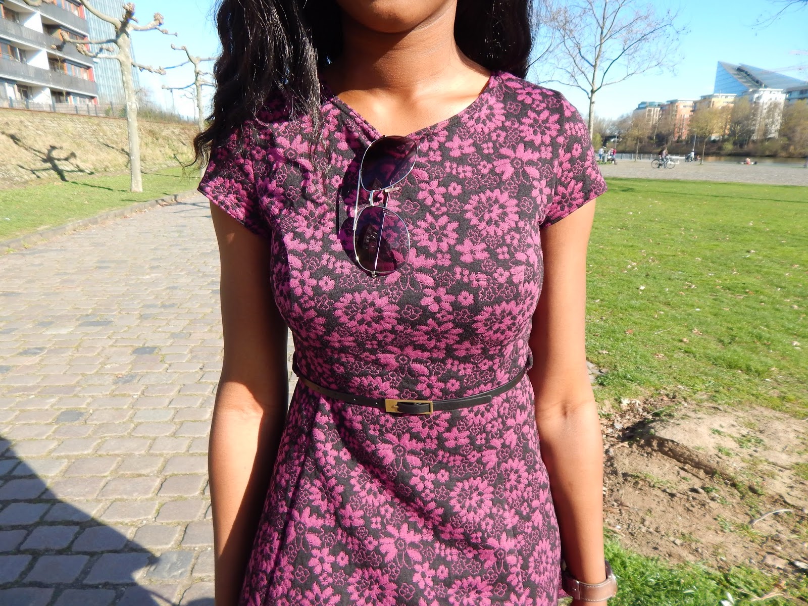 Endlich ist der Frühling da! Zumindest war er es für ein paar Tage. Wenn ich jetzt so aus dem Fenster schaue, sieht es doch nicht mehr so ganz danach aus. Als die Sonne aber schien habe ich es mir nicht nehmen lassen einen kleinen Spaziergang am Main entlang zu tätigen. Dabei trug ich ein neues Kleid, dass ich letzten Winter gekauft habe. Da es im Schatten doch nicht ganz so warm war, trug ich darüber eine Jacke, dazu Booties, eine Sonnenbrille, und eine einfache Tasche.