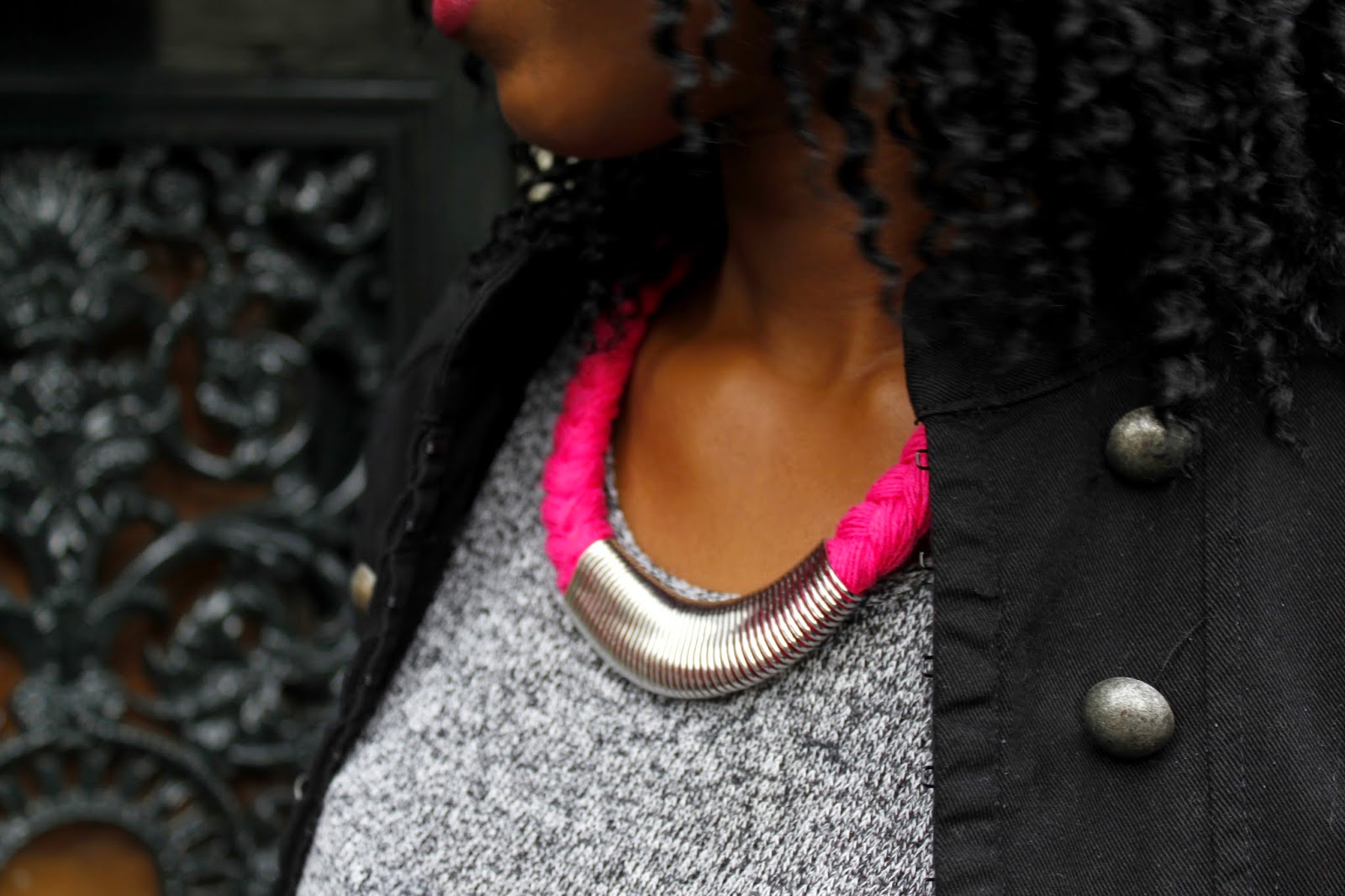 Obwohl es viel regnete, war es nicht besonders kalt, so konnte ich ohne Sorgen meinen schwarzen Rock tragen. Dazu ein graues Shirt, ein schwarzer Blazer, Boots, und als farblicher Tupfer eine pinke Statementkette, die ich Minuten vorher von meiner besten Freundin geschenkt bekommen hatte.