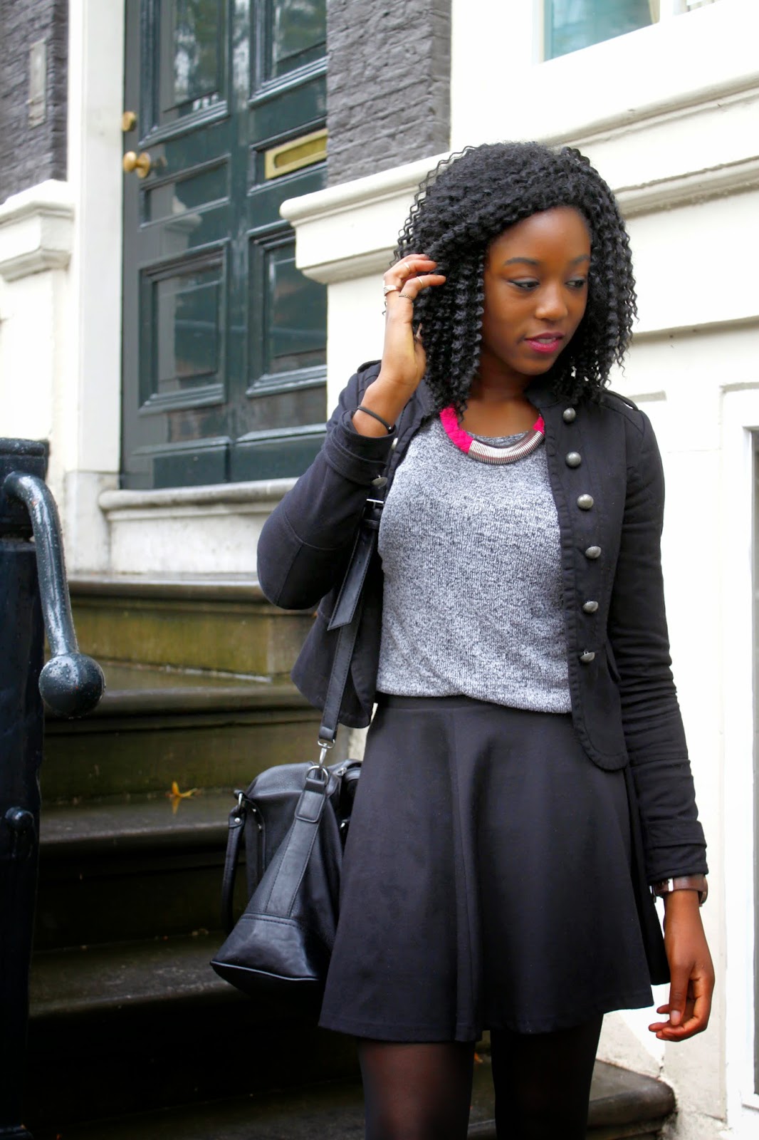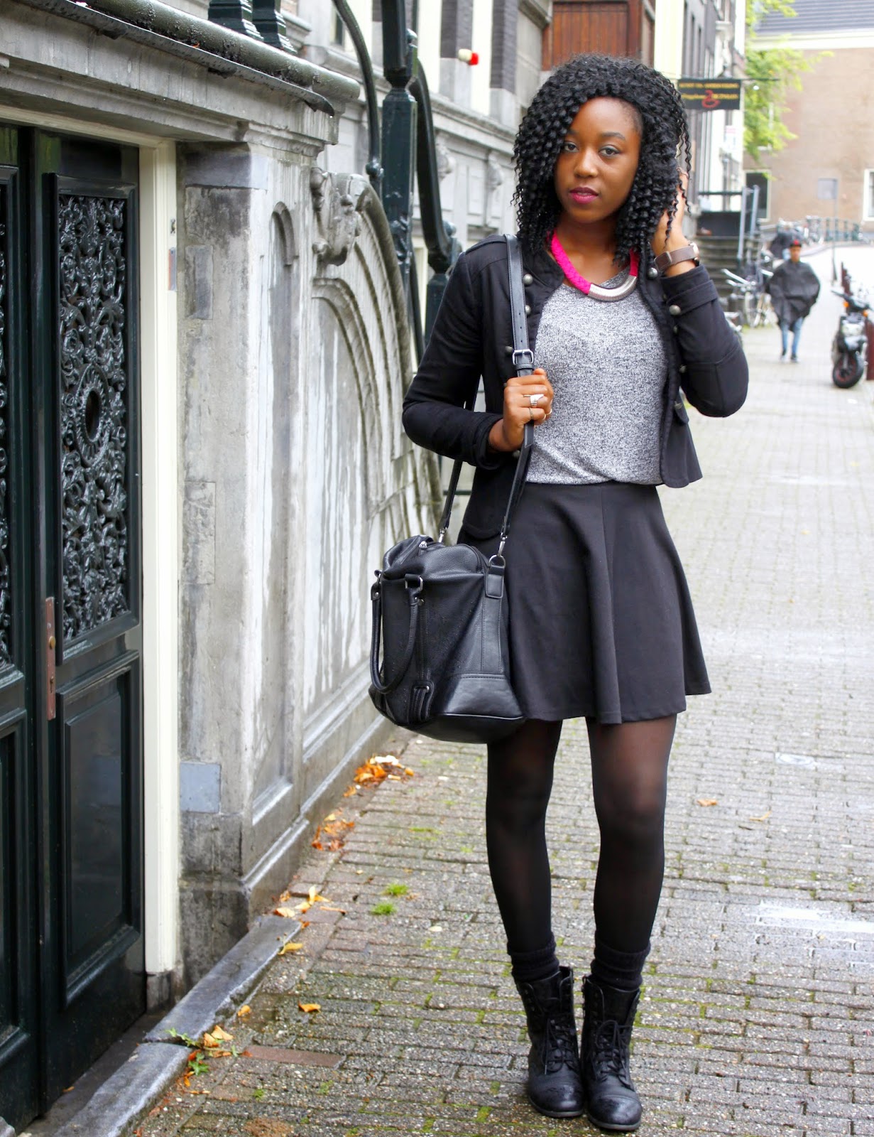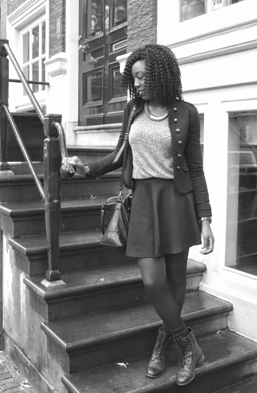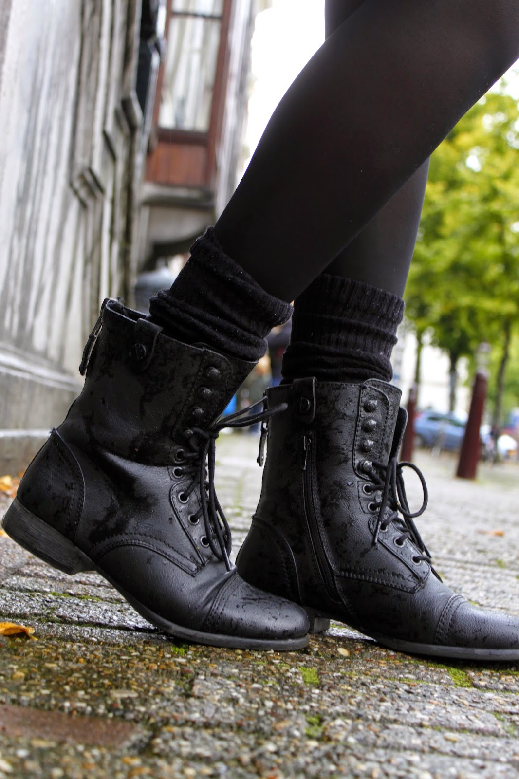 jacket, skirt: new yorker // shirt: primark // boots: deichmann // leg warmers, rings: h&m // bag: ernsting’s family // statement necklace: takko
